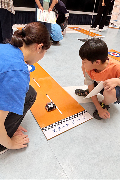 ロボカーリングでは、子どもたちはスタッフのサポートを受けながら、ロボットカーの走る時間を設定しました。何回か試走した後に本番のスタートラインにロボットを置きスタート。見事的の中心を捕えた時は、飛び上がって喜ぶ姿が見られました。