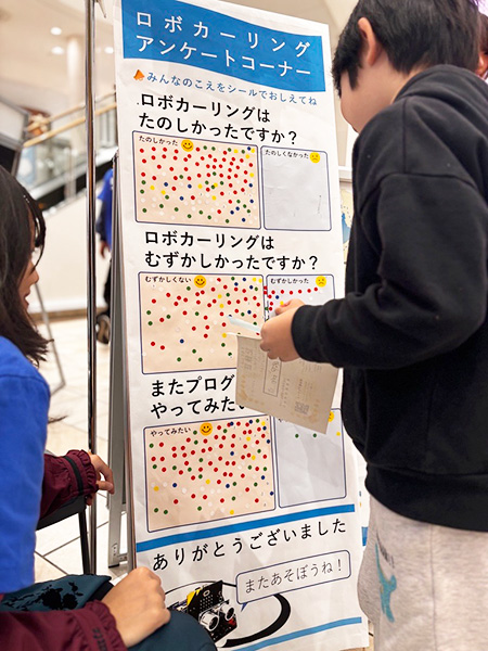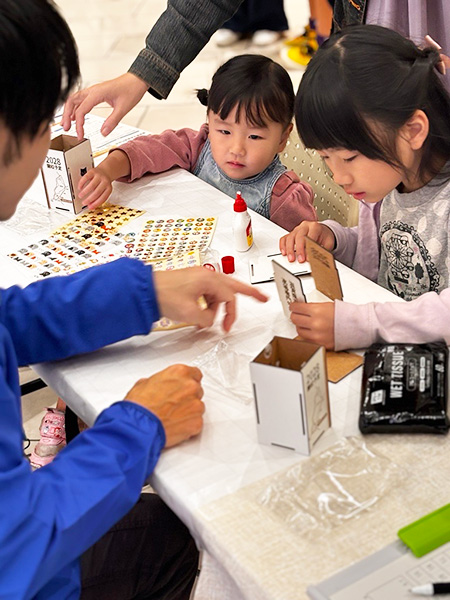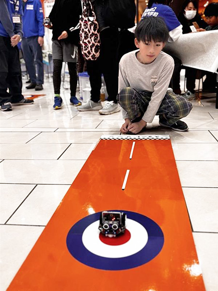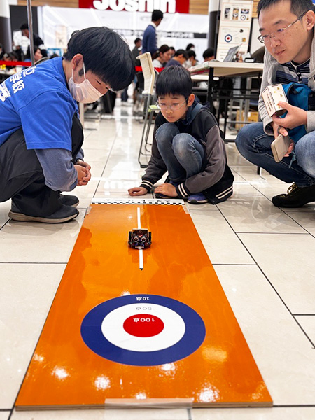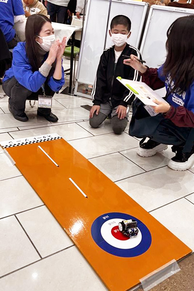 ロボットカーにプログラミング(動作の指令)を設定し、的をめがけて走らせる「ロボカーリング」を実施。子どもたちはスタッフのサポートを受けながら、的の中心を狙いました。また、オリジナルペン立てづくりにも多くの子どもたちが参加し、レーザー加工で「滋賀県立高等専門学校」と刻印された木枠のペン立てを組み立て、家へ持ち帰ってくれました。