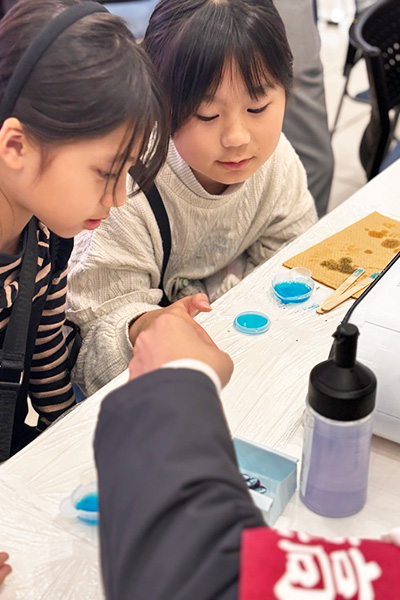 今回のイベントでは、「キーホルダー製作」を実施され、子どもたちからは「どうして光をあてると固まるの?」と興味津々に先生に尋ねていました。子どもたちが製作をしている間に隣にいる保護者の方には「学校紹介・進路相談」が行われ、高専についての理解を深めていただきました。